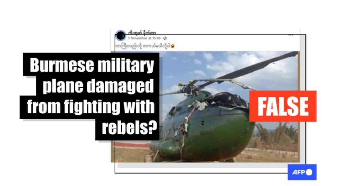 The photo spread across anti-junta Facebook accounts shortly after a similar false claim emerged in the form of a video presented as a junta helicopter stormed by the Arakan Army (AA) ethnic armed group in Myanmar's restive Rakhine state.