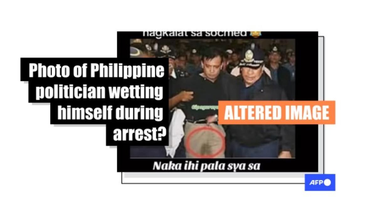 The image, appearing to show Trillanes with a stain on the front of his trousers as he is led away by police, was shared more than 7,600 times after it was posted on Facebook on November 14, 2024.