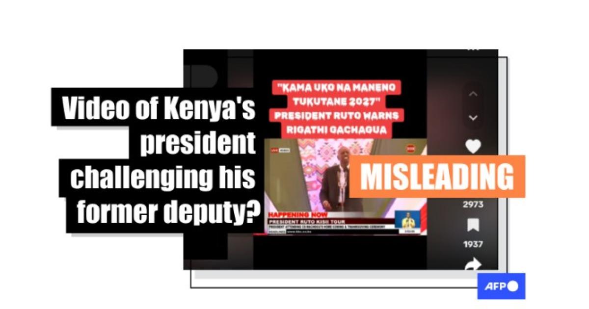 Two years after assuming office, Kenya’s President William Ruto fell out with his former deputy Rigathi Gachagua, who was impeached in October 2024. A TikTok video shared days after Gacahagua’s removal claims to show Ruto challenging him to face off in 2027 when the next presidential election is scheduled. The claim, however, is misleading; the clip was filmed in 2023 and shows Ruto talking about opposition leader Raila Odinga, and not Gachagua, who was still in office last year.