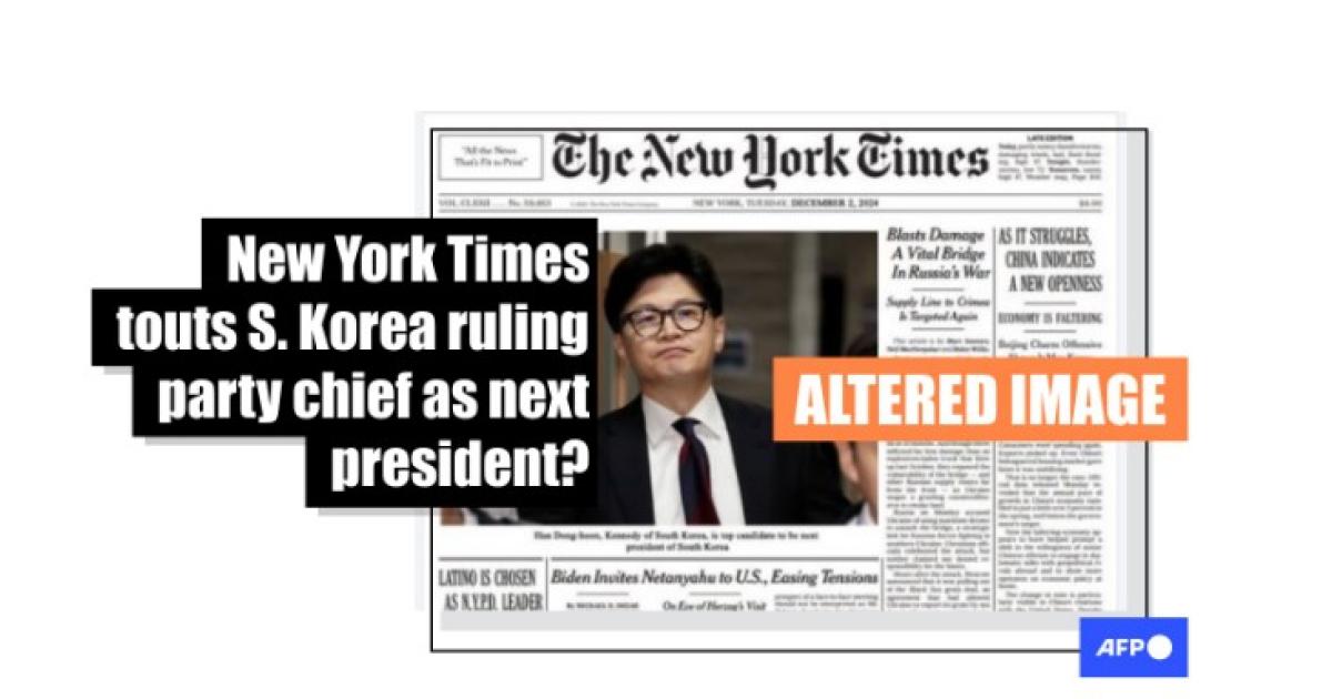 "Chairman Han Dong-hoon appears on the New York Times front page," read a Korean-language Facebook post that shared the doctored picture.