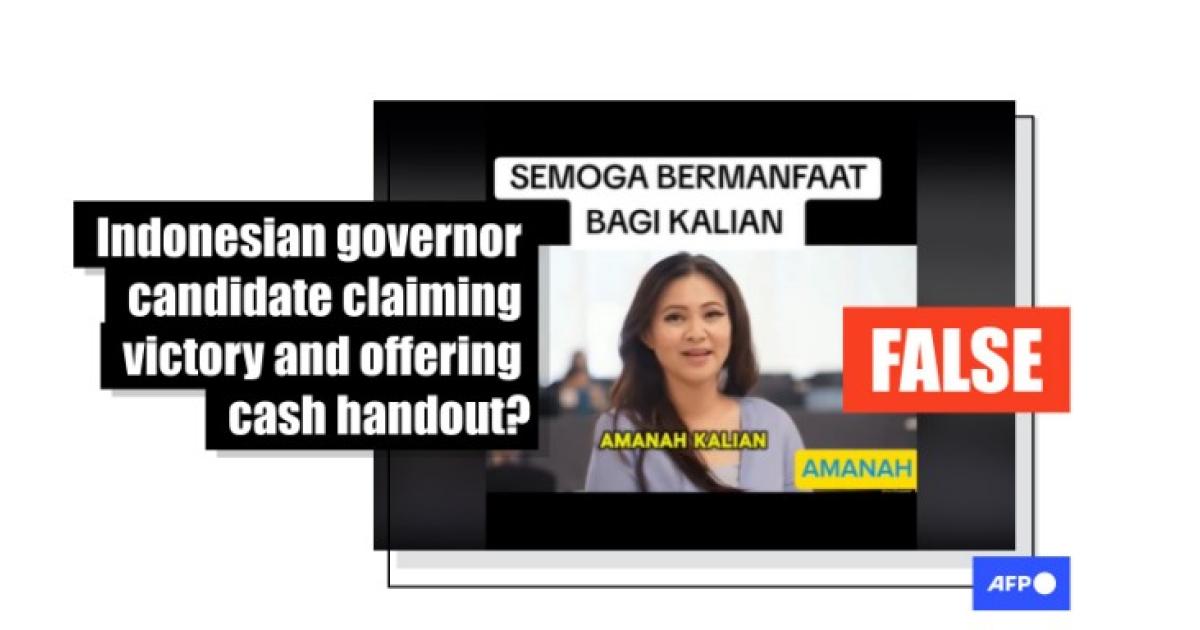The clip is similar to another video debunked by AFP which also appeared to show an Indonesian gubernatorial candidate declaring victory and offering financial aid.