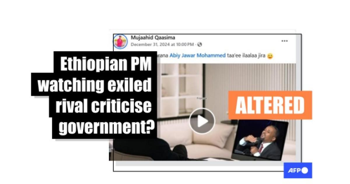 Since late December 2024, Ethiopian politician Jawar Mohammed has been promoting his memoirs in Europe and talking about political crises at home that he blames on Prime Minister Abiy Ahmed. A video published on Facebook purports to show Abiy watching one of Jawar’s critical speeches on a laptop. However, this is false; AFP Fact Check found that an image of Abiy taken in 2020 during an online discussion with East African leaders was altered. The clip of Jawar speaking in Amsterdam was added to the laptop’s screen to make it appear as though Abiy was watching a live event.
