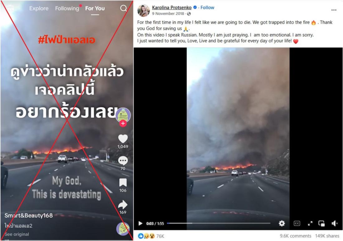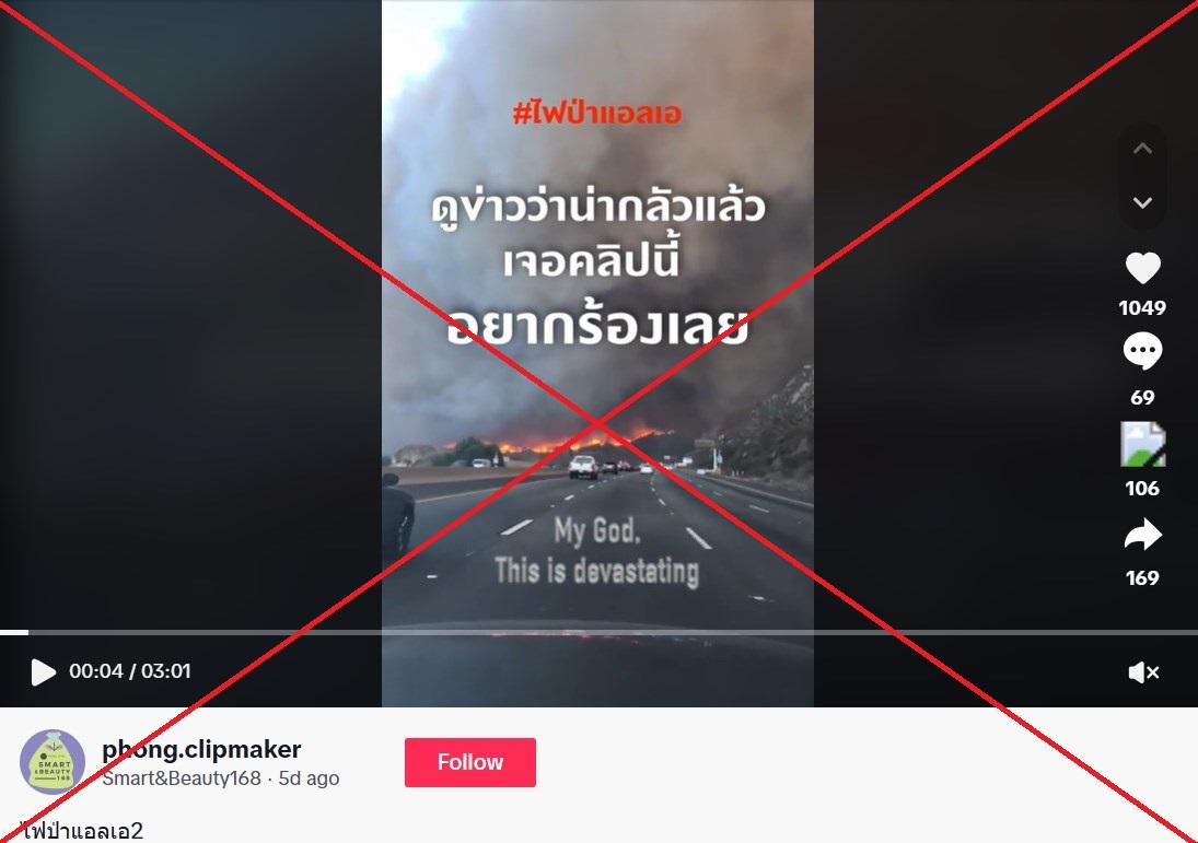 "#LAfire. I saw the news and it was already scary. I watched this clip and want to cry," reads Thai-language text overlay on a TikTok post from January 6, 2025.