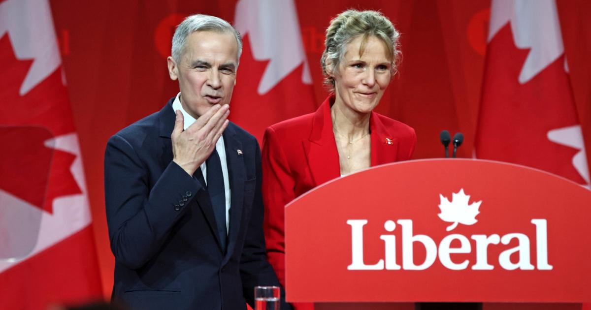 Reverse image search reveals the picture is an altered version of a real image from the Reuters news agency of the Carney couple on March 9 when Mark Carney won the Liberal leadership race.