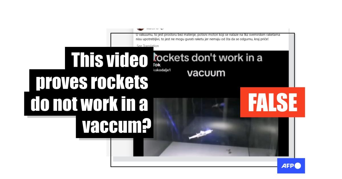 "In a vacuum, which is space without matter, thrusters found on so-called space rockets are not usable, they cannot push the rocket because they don't have anything to push against, end of story", wrote a Facebook user in a March 10, 2025 post in Croatian. Alongside the post, he shared a TikTok video of a syringe in a large transparent chamber, which ejects white smoke before starting to move.