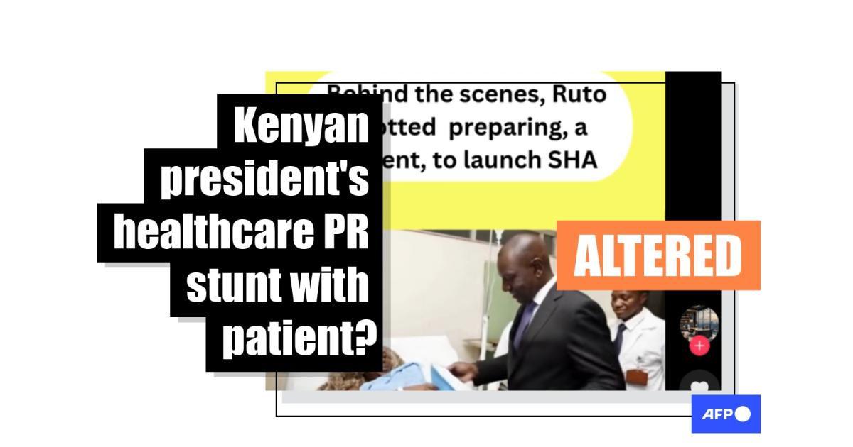 Kenya’s President William Ruto launched the Social Health Authority (SHA) in October 2024 to replace the National Hospital Insurance Fund (NHIF) as the state’s health insurance provider, prompting criticism from his opponents. Yet a TikTok video that claims to show him “preparing” a hospital patient for the press launch has been created with AI software from an image taken in 2019. The original photo shows Ruto, who was then deputy president, visiting a victim of a terror attack.