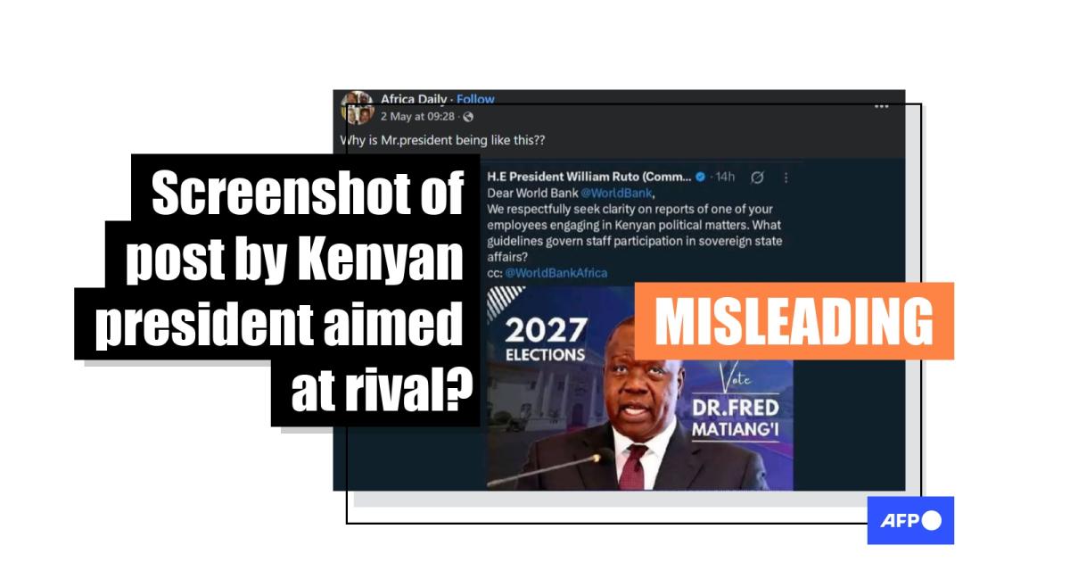 With Kenya's 2027 general election approaching, candidates are emerging to challenge President William Ruto. Among them is former cabinet secretary Fred Matiang’i, who is set to resign from his World Bank job in the United States to pursue his political aspirations. A screenshot widely shared on Facebook purports to show an X post from Ruto questioning whether Matiang’i is allowed to run for office as an employee of the World Bank. But this is misleading; the X post originated from a parody account and not from Ruto.