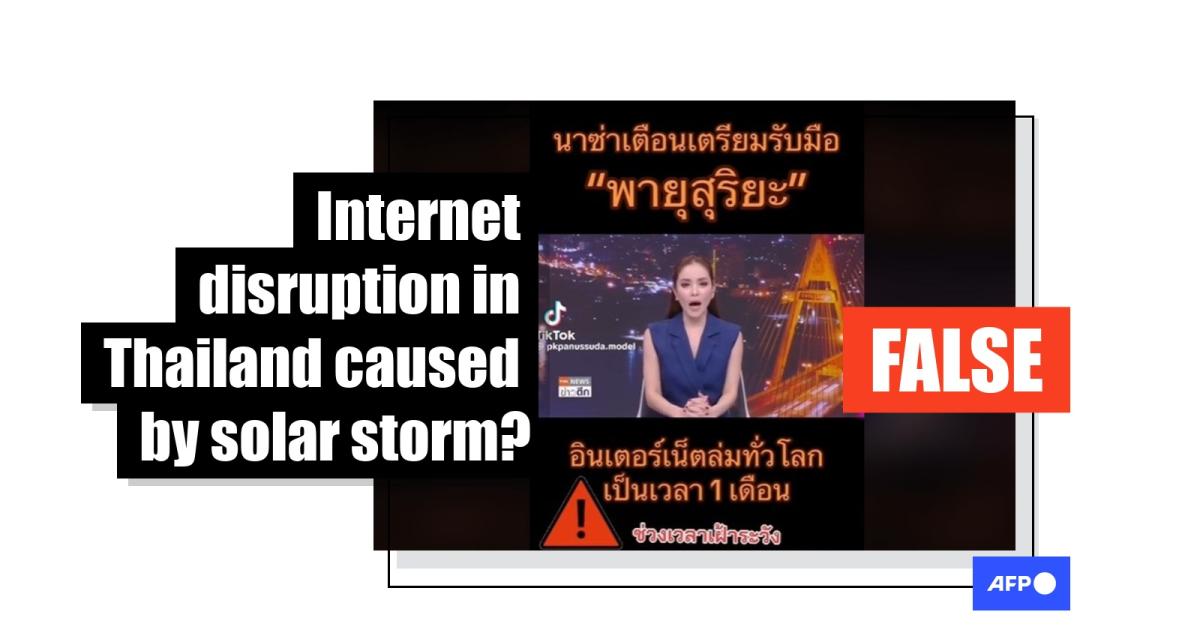Thai telecom company True Corp says a network outage that disrupted mobile and internet services to millions of subscribers on May 22, 2025 was caused by a power failure, contrary to posts claiming a solar storm was to blame. An astrophysicist told AFP there was no solar activity strong enough to knock out services on that day, and a solar storm would affect the planet's entire magnetic field rather than Thailand alone.