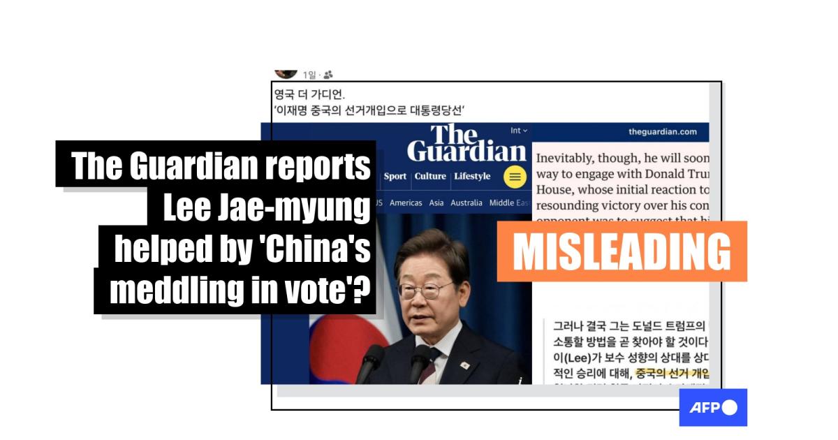 After South Korea's centre-left opposition leader Lee Jae-myung was elected president, an excerpt from an article in The Guardian was shared in posts misleadingly claiming the newspaper reported that election interference from China had helped him win. The article was in fact analysing comments from an unnamed White House official in the immediate aftermath of Lee's victory about the United States' concerns regarding "Chinese interference and influence in democracies around the world".