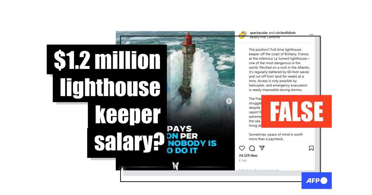 Despite this information, a keyword search AFP conducted for "La Jument lighthouse 1.2 million salary," using Microsoft's Bing browser on July 18, provided an AI-generated summary affirming the eye-popping pay to work at the site, offering social media posts and a false article as the evidence.