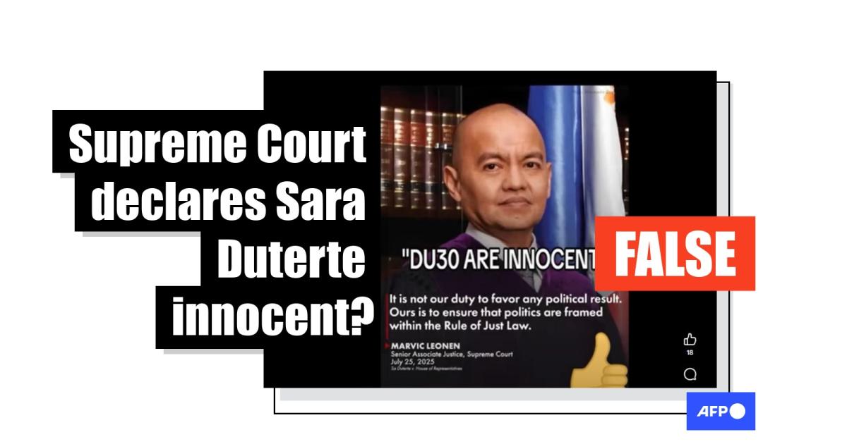 "Du30 are (sic) innocent. It is not our duty to favor any political result. Ours is to ensure that politics are framed within the Rule of Just Law," reads text written on an apparent news graphic shared July 26, 2025 on Facebook.