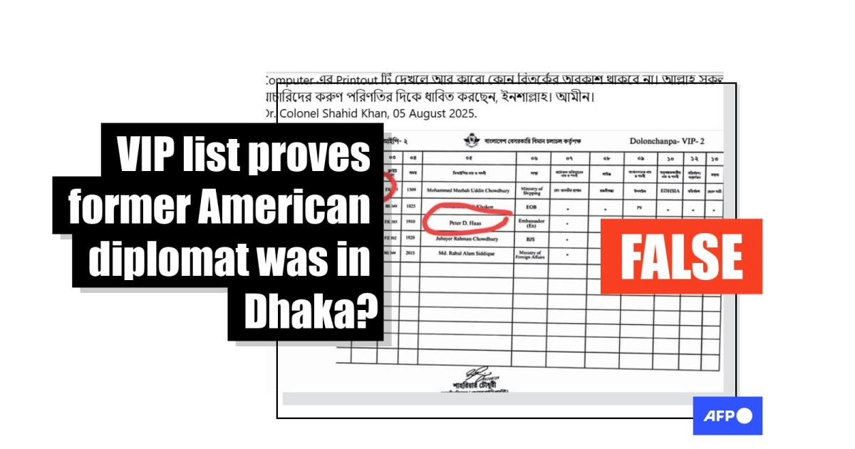 "Peter Haas was in Bangladesh until he departed on Emirates' flight EK-583 today, August 5, 2025 at 19:10," reads part of the image's Bengali-language caption.