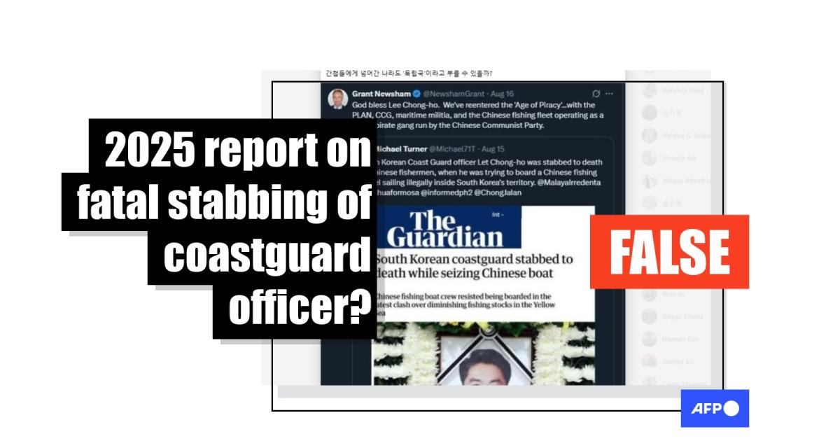 It includes the screenshot of a report from The Guardian about a South Korean coastguard officer stabbed to death while seizing a Chinese boat, which the user claims was published just days prior.