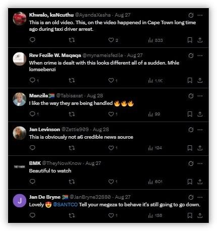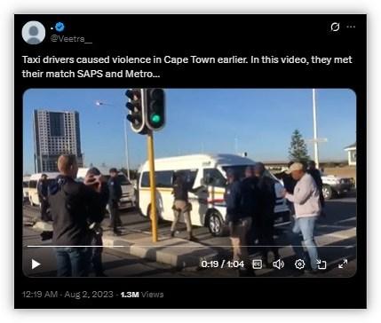 AFP Fact Check found the video was published on August 2, 2023, on X with the caption: “Taxi drivers caused violence in Cape Town earlier. In this video, they met their match SAPS and Metro…(sic)” (archived here).