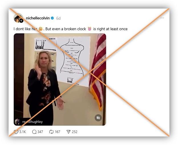 The video appears to show Greene fixing a large poster to the wall outside her Capitol Hill office.
