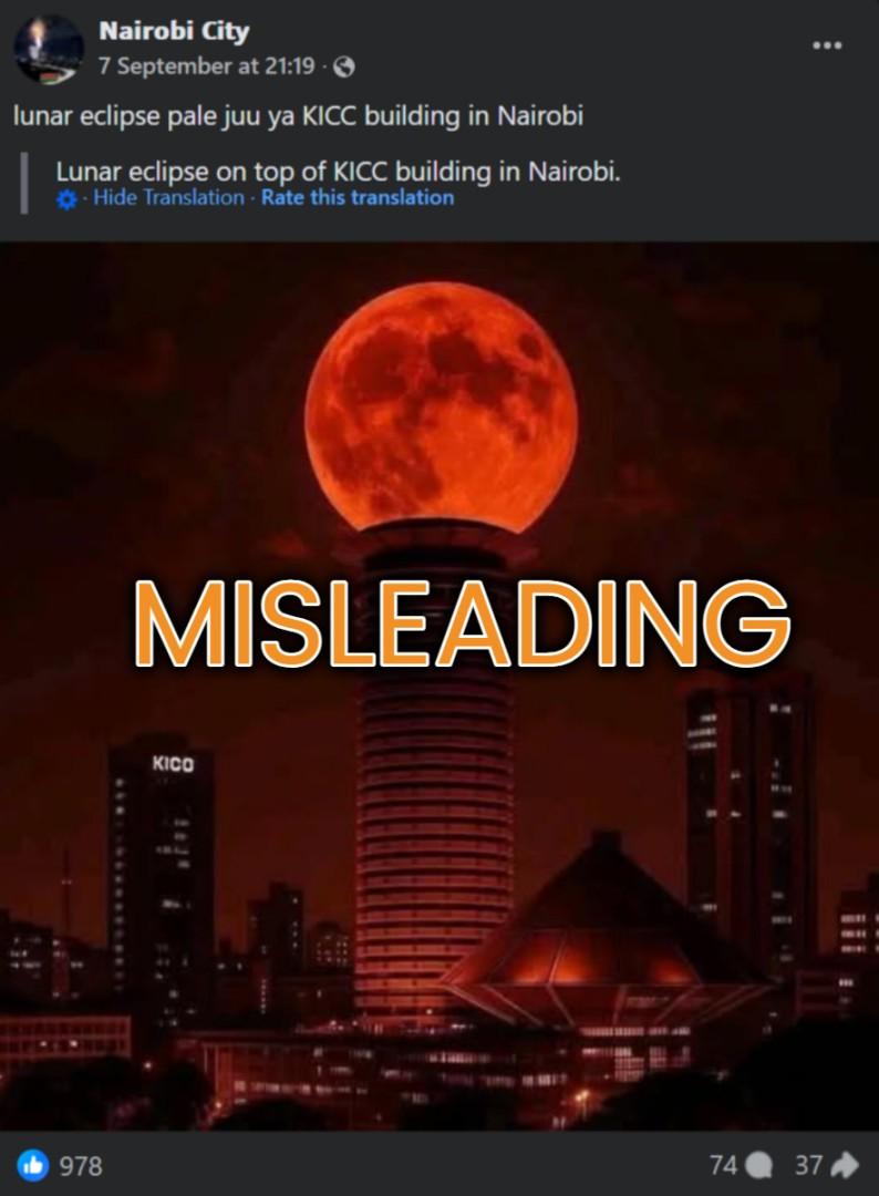 “Lunar eclipse on top of KICC building in Nairobi (sic),” reads an English and Swahili Facebook post published on September 7, 2025.