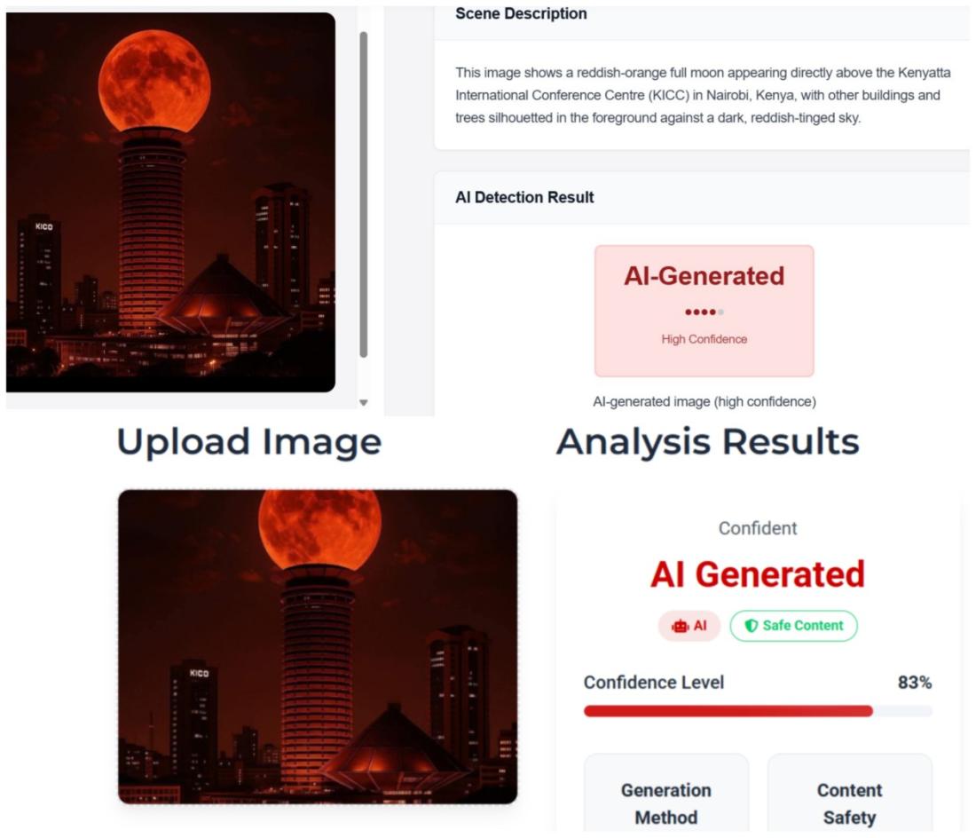While the KICC’s cylindrical shape is recognisable, the moon is unrealistically oversized and appears to cast its reddish glow over the entire city.