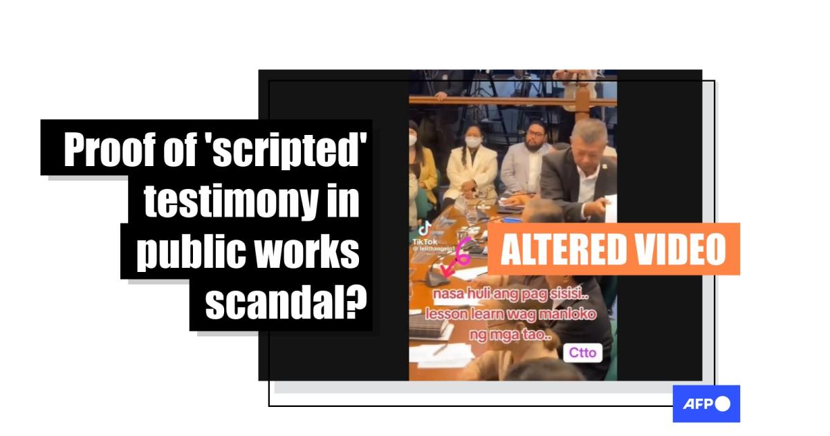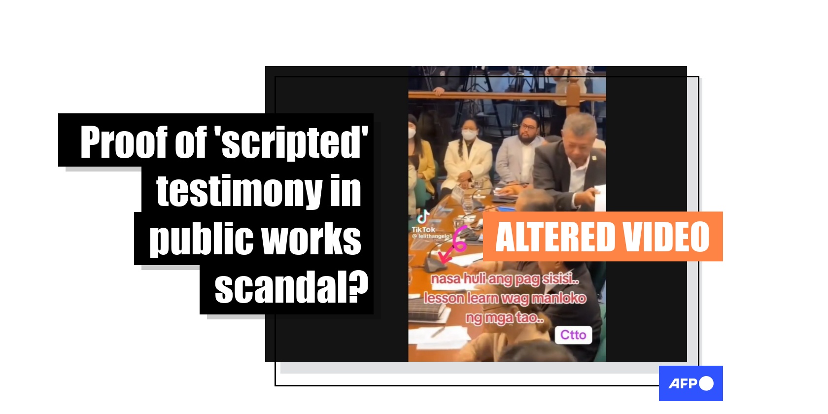 Philippine lawmakers and former officials have become embroiled in a ballooning graft scandal involving bogus flood control projects, but social media users claiming an informant's testimony is "scripted" have shared a manipulated video. The footage of the Justice Department chief passing along the affidavit has been played in reverse to appear as if he slipped the whistleblower a different statement.