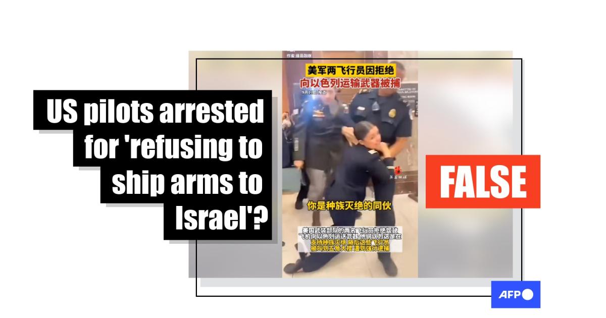 But the circulating video does not depict two pilots being arrested for protesting against the delivery of arms to Israel.