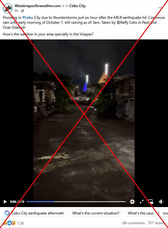 Its caption reads, "Flooding in #Cebu City due to thunderstorms just an hour after the M6.9 earthquake hit. Continuous rain until early morning of October 1, still raining as of 3am."