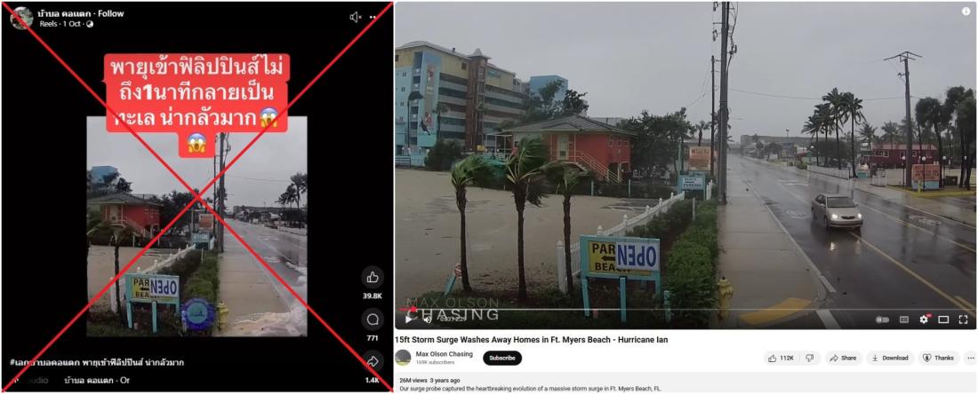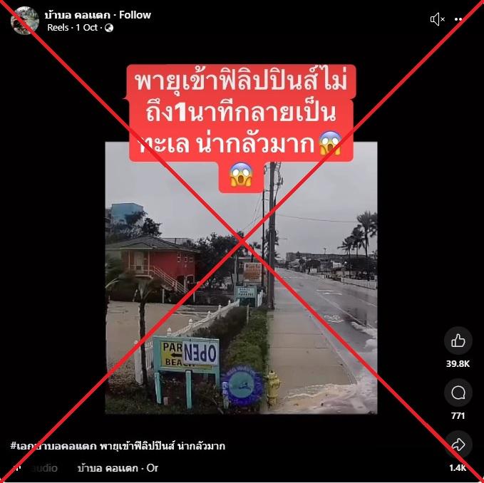 "Storm hits the Philippines. Within a minute, the place turned into the sea. So scary," reads Thai-language text superimposed on a Facebook video shared on October 1, 2025.