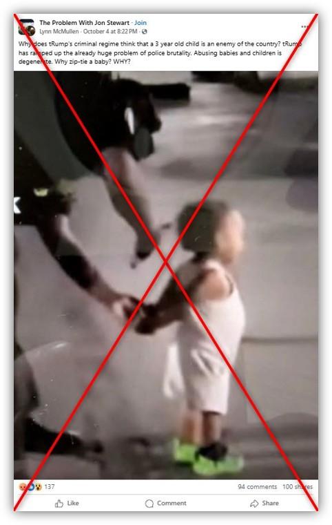 "Why does tRump's criminal regime think that a 3 year old child is an enemy of the country?" says an October 4, 2025 post on Facebook. "tRump has ramped up the already huge problem of police brutality. Abusing babies and children is degenerate. Why zip-tie a baby? WHY?"