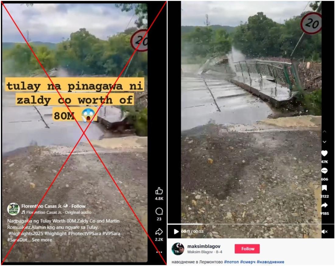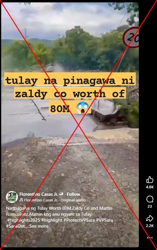 "Zaldy Co and Martin Romualdez built a bridge worth 80 million (pesos) ($1.39 million). Look at what happened to it," its Tagalog-language caption said, referring to two Philippine lawmakers whose names have surfaced in a mounting corruption scandal of fraudulent flood control projects.