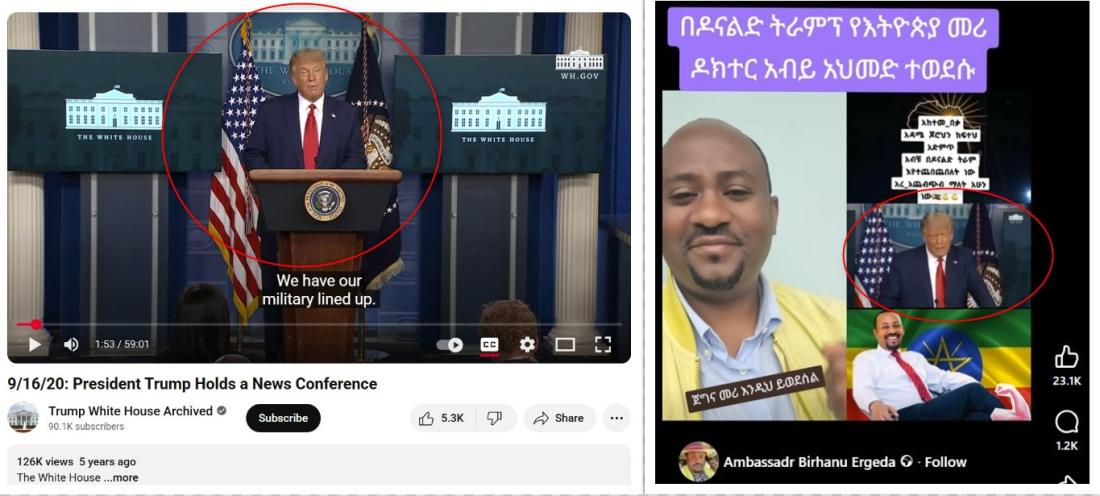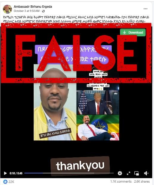 “Ethiopian leader Dr Abiy Ahmed was hailed by Donald Trump,” adds a text overlay on the 46-second video, which includes separate panels containing images and two embedded clips running simultaneously.