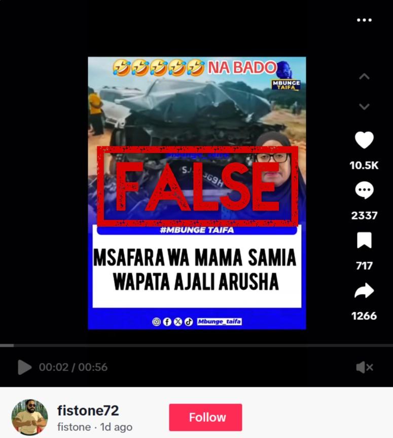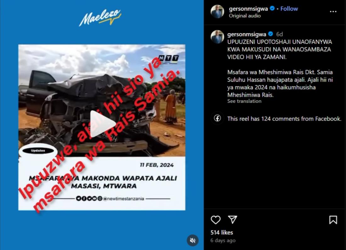 “Ignore the deliberate misinformation being spread by those sharing this old video,” the post in Swahili reads. “The motorcade of Her Excellency President Dr. Samia Suluhu Hassan has not been involved in any accident. This accident occurred in 2024 and did not involve the President.”