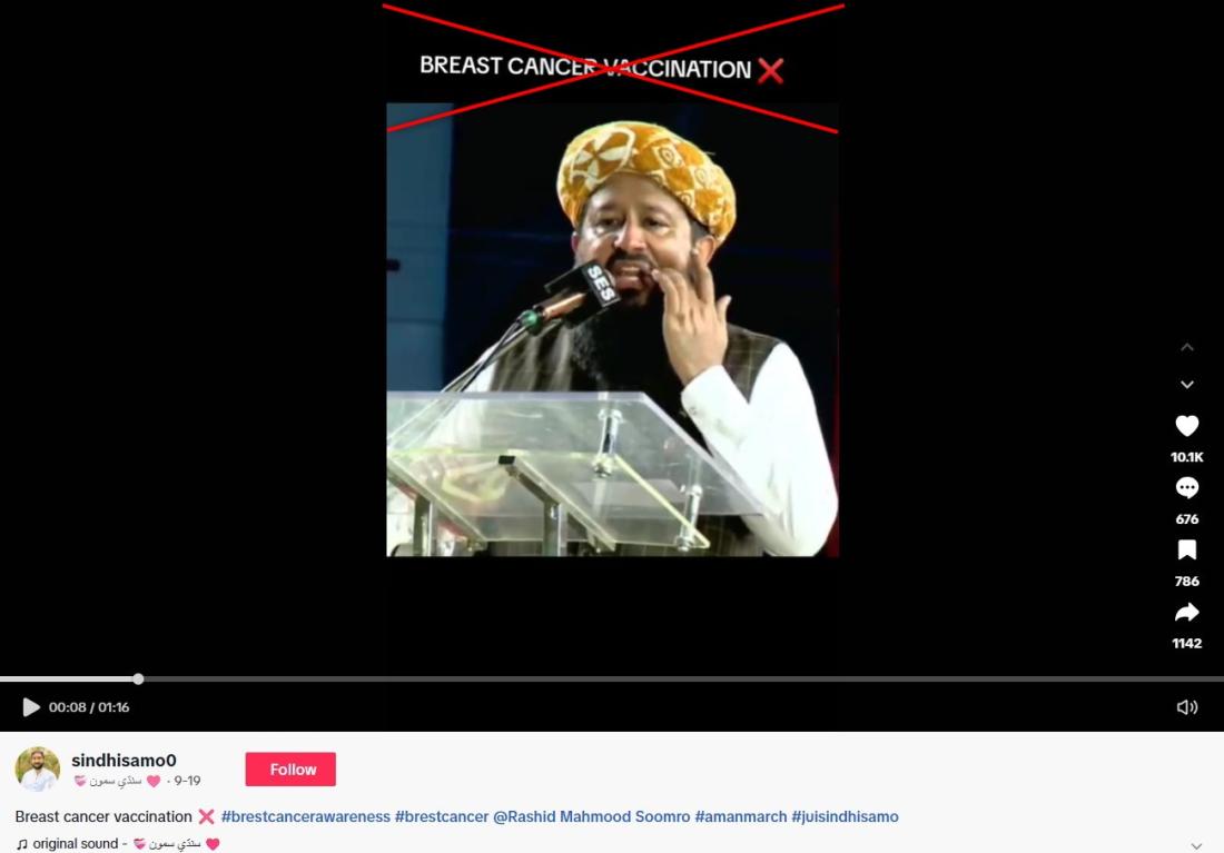 Soomro's speech also circulated on YouTube while similar claims linking the HPV vaccine to infertility were shared elsewhere on TikTok and on X.