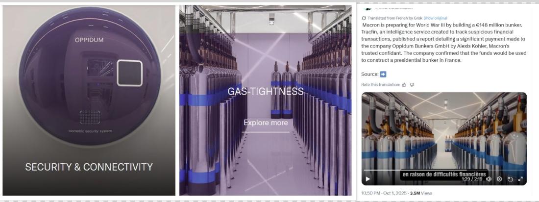 The video shows illustrative images of a bunker and an alleged transfer order for 50 million euros from French bank Société Générale, dated September 4, 2025. It is in the name of Alexis Kohler, former secretary general of the Élysée Palace, and is made out to Oppidum Bunkers GmbH, a Swiss company known for building luxury underground bunkers.