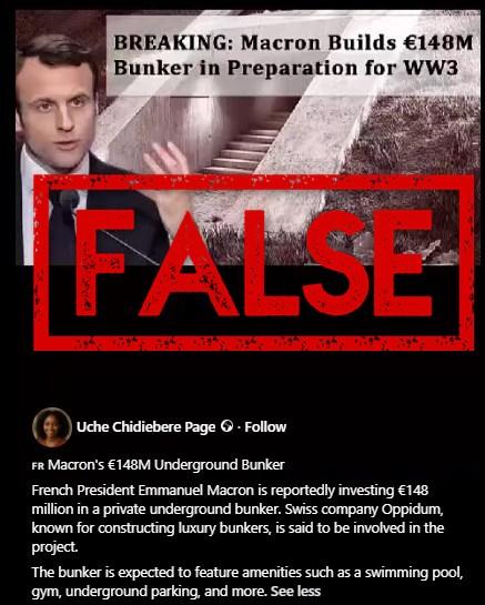 A caption of a video post circulating on Facebook in Nigeria claims: “French President Emmanuel Macron is reportedly investing €148 million in a private underground bunker.”