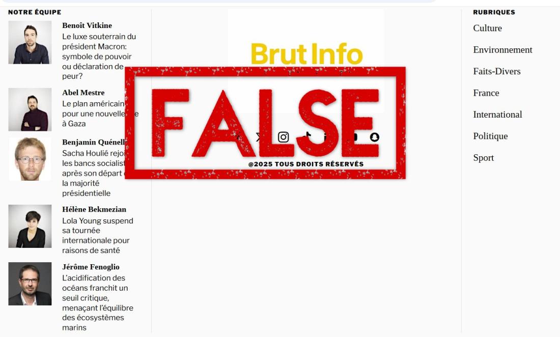 The French posts also reference a website called "brutinfo.fr" to support the claim about Macron’s bunker. However, this impersonates the name of the well-known media outlet Brut.