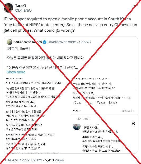 Her post reads: "ID no longer required to open a mobile phone account in South Korea 'due to fire at NIRS' (data center). So all these no-visa entry Chinese can get cell phones. What could go wrong?"
