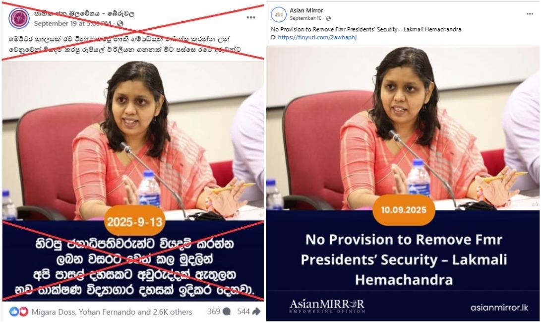 Asian Mirror has also shared the report on its Facebook page with a news graphic that reads, "No provision to remove fmr presidents' security -- Lakmali Hemachandra" (archived link).