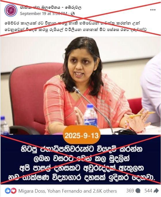 "The trillions of rupees spent on maintaining the old scoundrels who have been destroying the country will, from now on, be passed on to the children of the country," reads a Sinhala-language Facebook post shared on September 19, 2025, referring to former presidents and politicians.