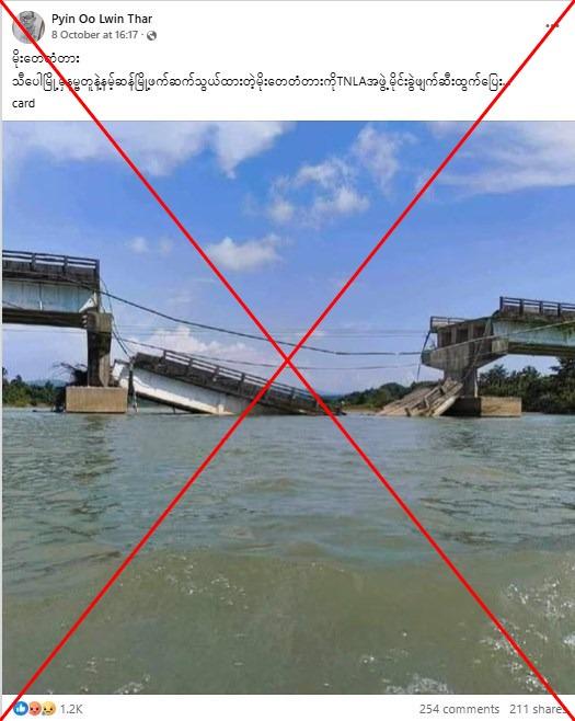 "The TNLA group detonated and destroyed the Moe Tay Bridge, which connects Hsipaw with Namtu and Namsang townships, and fled," reads a Burmese-language Facebook post on October 8, 2025, using the acronym for the ethnic armed group Ta'ang National Liberation Army and mentioning three towns in Myanmar's war-wrecked Shan state.