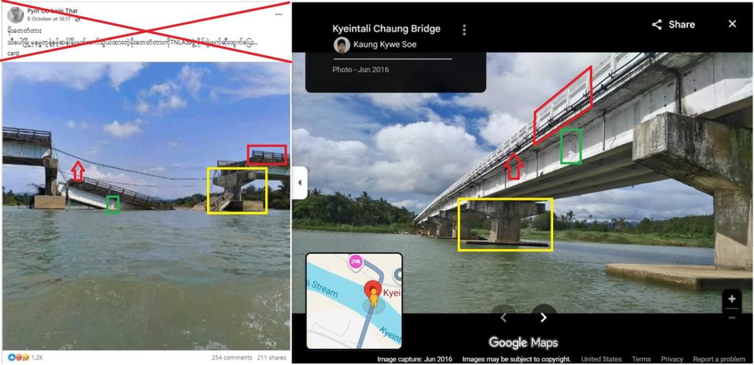 AFP was able to confirm the location of the bridge by comparing it to geotagged images of the Kyeintali Chaung Bridge on Google Maps (archived link).