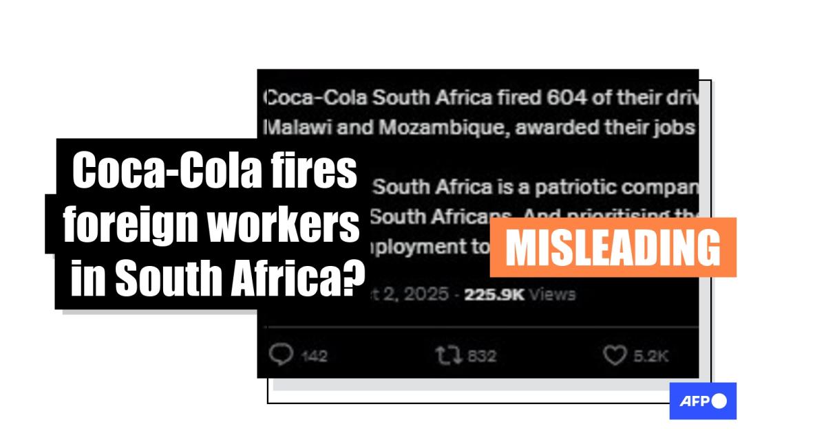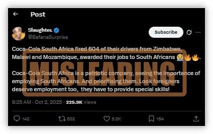“Coca-Cola South Africa fired 604 of their drivers from Zimbabwe, Malawi and Mozambique, awarded their jobs to South Africans,” reads an X post published on October 2, 2025.