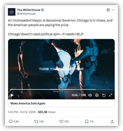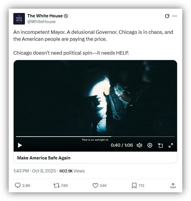 "An incompetent Mayor," the White House's official X account captioned the October 8, 2025 post. "A delusional Governor. Chicago is in chaos, and the American people are paying the price. Chicago doesn't need political spin -- it needs HELP."