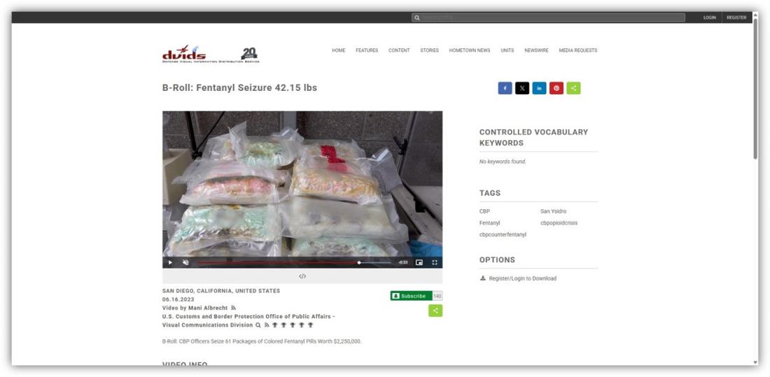 The video's close-up shots of fentanyl and other illicit drugs seized by federal agents also come not from Chicago, but from DVIDS b-roll footage of narcotics confiscated near the southern US border in San Diego, California in June 2023 and Nogales, Arizona in November 2023 (archived here and here).