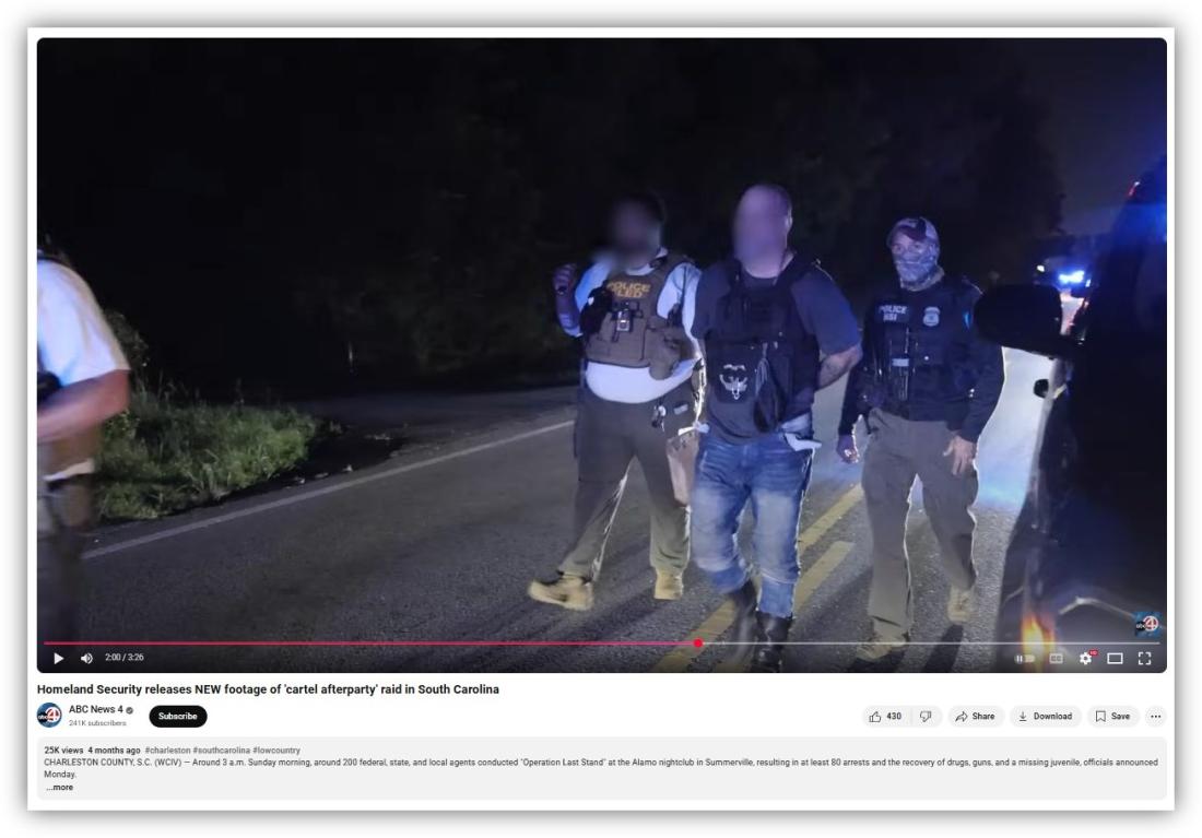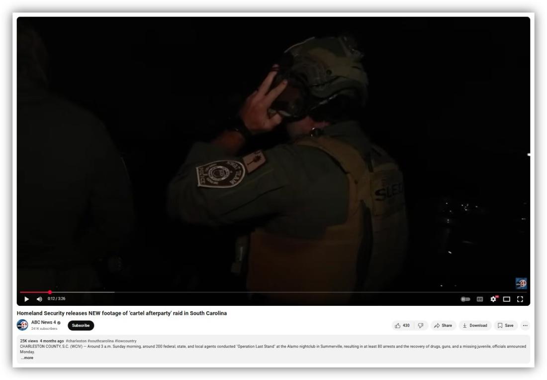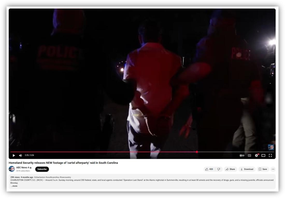 The White House's Chicago video further pulled from ICE footage of a June 2025 mission, dubbed "Operation Last Stand," in which agents made sweeping arrests and recovered drugs and guns at a nightclub in Charleston, South Carolina (archived here and here).