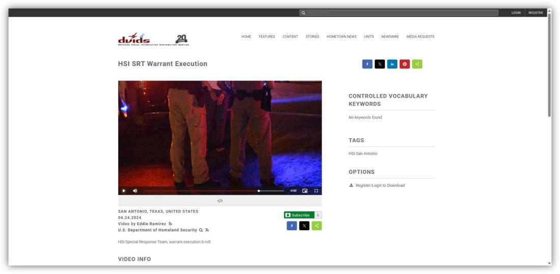 According to DVIDS, some of the clips show undocumented migrants boarding a deportation flight in Fort Bliss in February 2025 (archived here). Others capture Homeland Security Investigations teams under the Biden administration executing warrants in Uvalde in August 2024 and San Antonio in April 2024 (archived here and here).