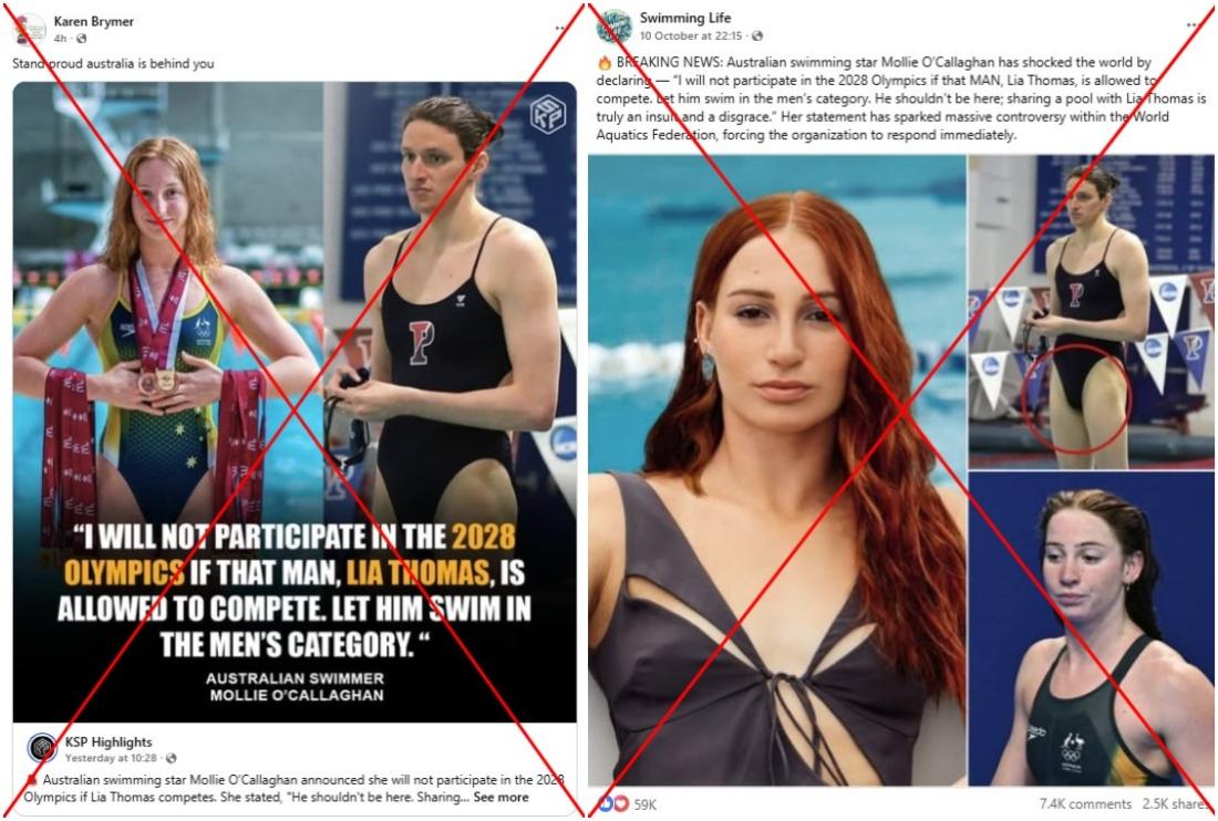 Gender eligibility in sports has frequently stoked furious debate on social media, with a recent torrent of posts claiming Olympic gold medallist Mollie O'Callaghan announced she would not participate in the 2028 Games if transgender swimmer Lia Thomas were allowed to compete. But there is no evidence O'Callaghan made the remarks, which the Swimming Australia organisation branded as "fabricated".