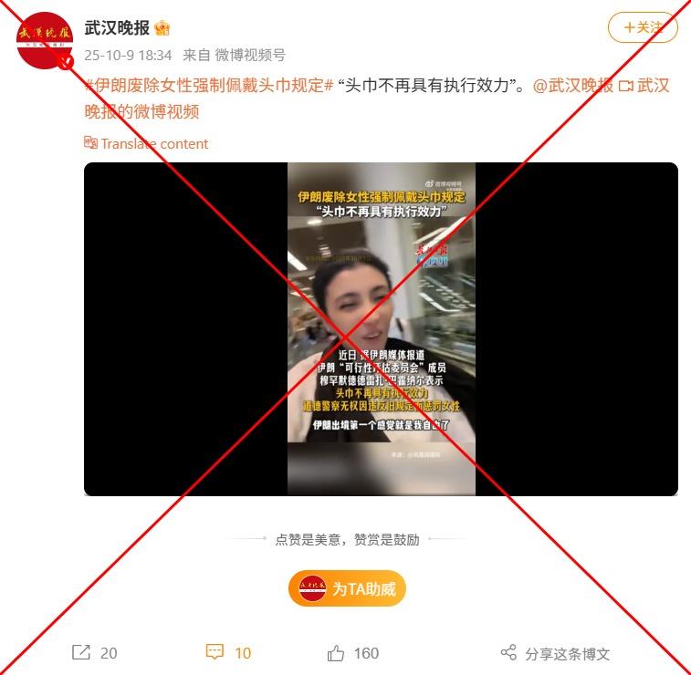 "Iran abolishes the mandatory hijab rule for women. 'The hijab (law) no longer carries enforcement power'," reads the simplified Chinese caption of a Weibo post shared October 9, 2025.