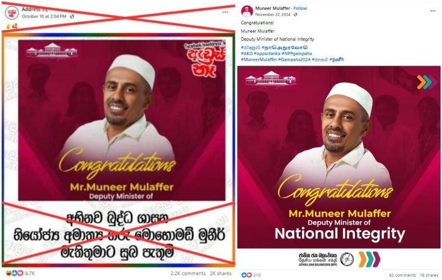 "Congratulations to the honourable new deputy minister of Buddhist Affairs, Mr. Mohammed Muneer," reads a Sinhala-language Facebook post shared on October 10, 2025.