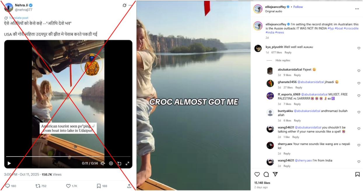 "A white woman from the USA was caught urinating in a lake in Udaipur," reads in part a Hindi-language X post shared on October 11, 2025. Text overlaid on the video repeats the claim.