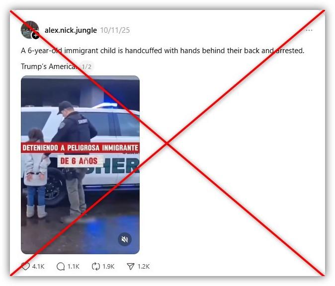"A 6-year-old immigrant child is handcuffed with hands behind their back and arrested. Trump's America," says an October 11, 2025 post on Threads.