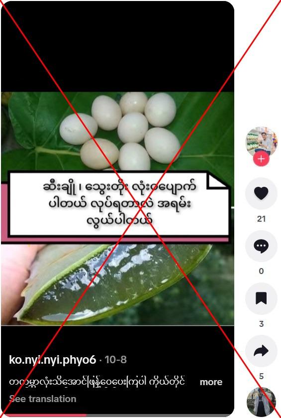 "Conditions like diabetes and hypertension can be effectively alleviated and cured using eggs and aloe vera," reads part of a Burmese-language TikTok post shared on October 8, 2025.