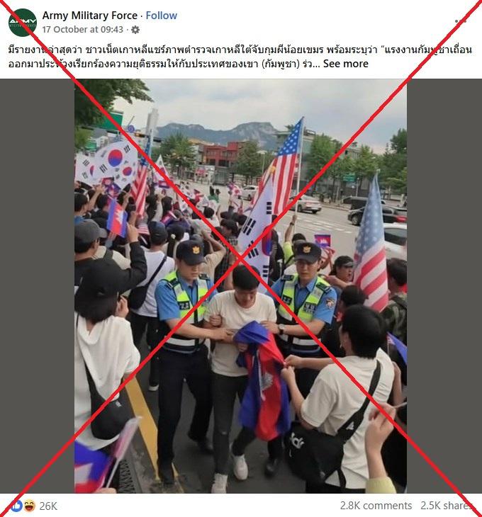 "South Korean netizens shared a photo of police arresting illegal Cambodian workers. They say, 'Illegal Cambodian workers in Korea protested demanding justice for their country. He and 12 others were arrested this morning ...'" reads a Thai-language Facebook post published on October 17, 2025.